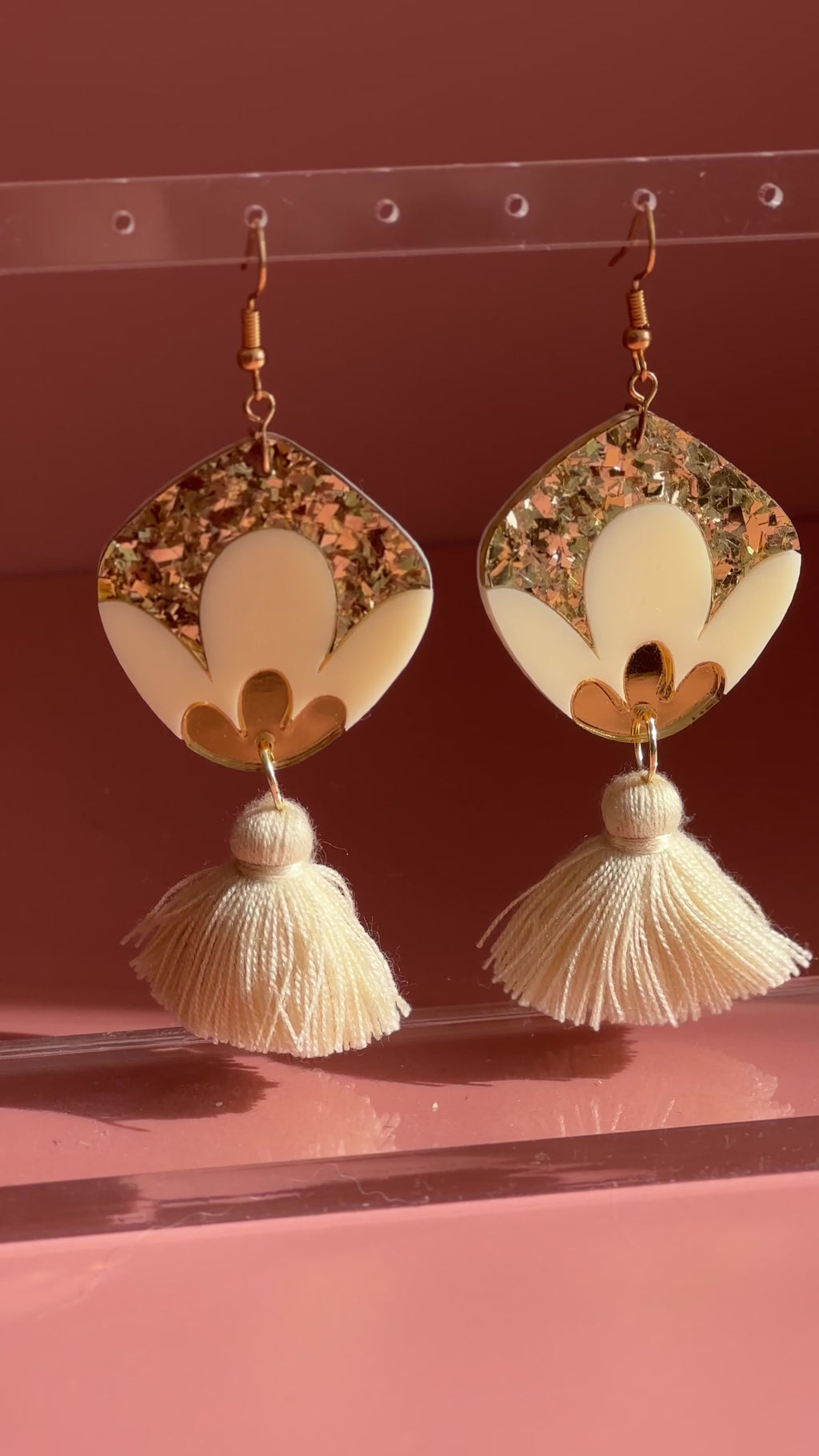 Featuring a hand-drawn floral motif in creamy ivory and glittering gold acrylic, these statement earrings bring major 70s disco energy with a touch of modern femininity. Finished with soft tassels that sway with every move, they’re made to dance the night (or day) away.